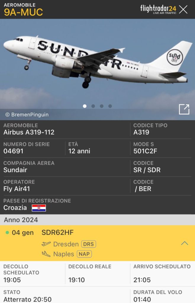 Il 4 gennaio 2024 e’ arrivato un A319/100 della conpagnia aerea croata FlyAir41 che opera per la tedesca Sundair.