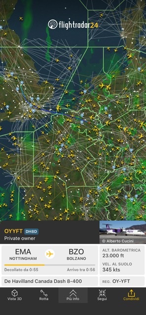Sempre con l’uso delle marche l’aereo sta volando da East Midlands verso casa a Bolzano. Ora e’ sull’Europa centrale sul Belgio dopo aver varcato la Manica proveniente dal Regno Unito e fra meno di un ora arrivera’ a Bolzano.