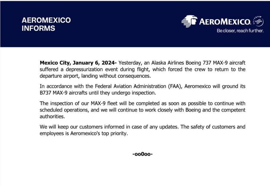 La nota e’ di quasi due giorni fa’ e di riferisce al fatto che ache Aeromexico ottemperera’ a quanto disposto da FAA circa la temporanea sospensione dell’attivita’ di volo dei suoi Boeing 737-9.