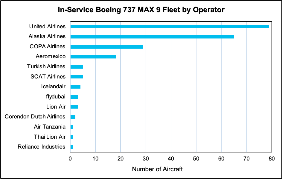 Utilizzando i dati di IBA Insight, stimiamo che circa l’85% della flotta globale di aerei 737 MAX 9 abbia installato il tappo della porta di uscita centrale.