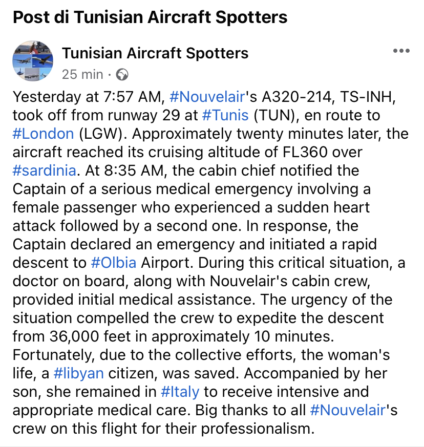Ieri mattina a Olbia e’ atterrato un A320-200 della compagnia aerea tunisina Nouvelair Tunisie per permettere ad una passeggera libica partita da Tunisi di poter ricevere le cure del caso a causa di un doppio arresto cardiaco. La notizia viene riportata su Facebook dal gruppo Tunisian Aircraft Spotters in un lungo e dettagliato racconto sul fatto che ha coinvolto l’aeromobile del vettore tunisino.