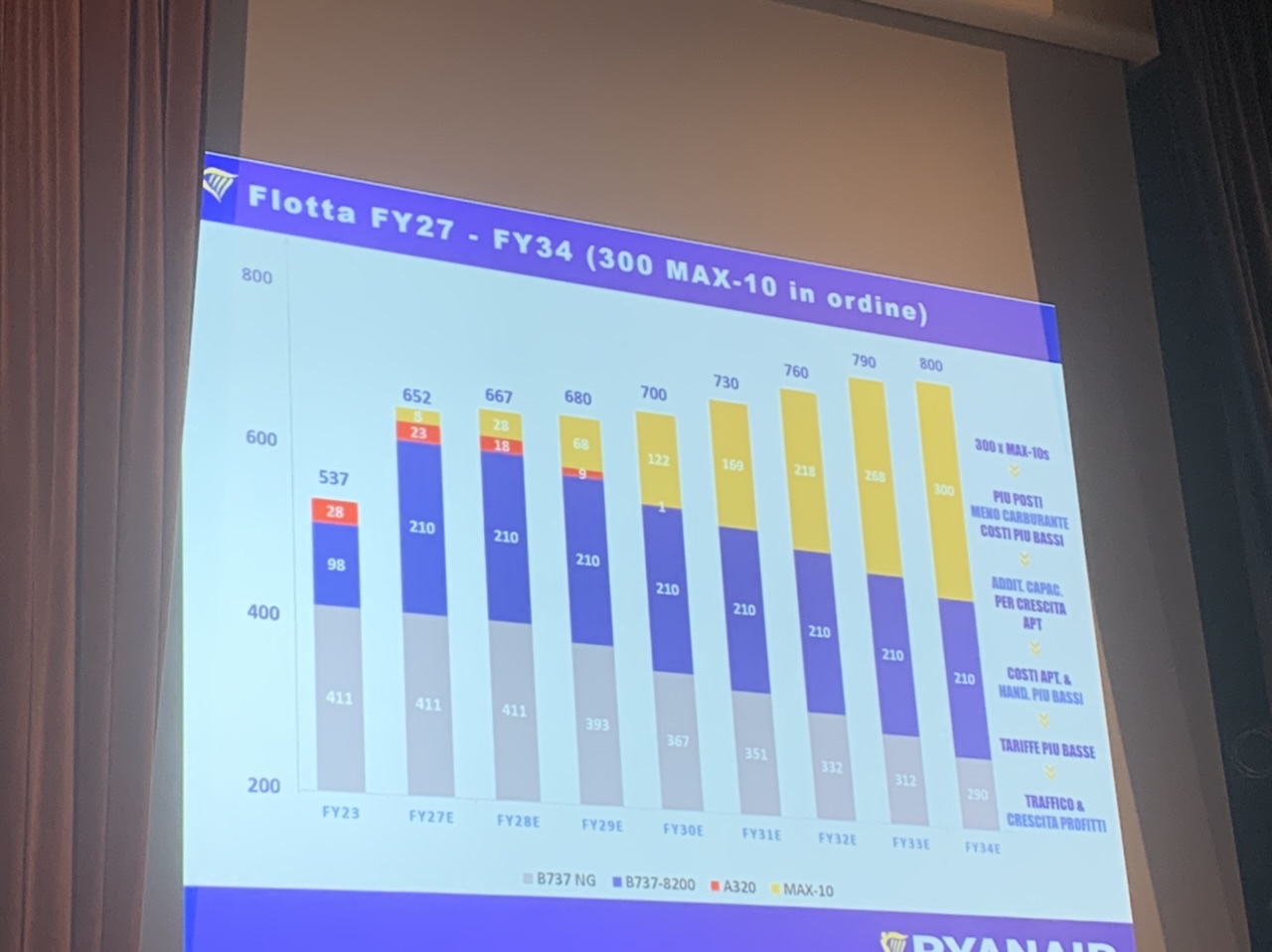 Ryanair ha svelato il piano flotta da qui’ al 2024, passera’ da 537 del FY2023 a 800 del FY2034.