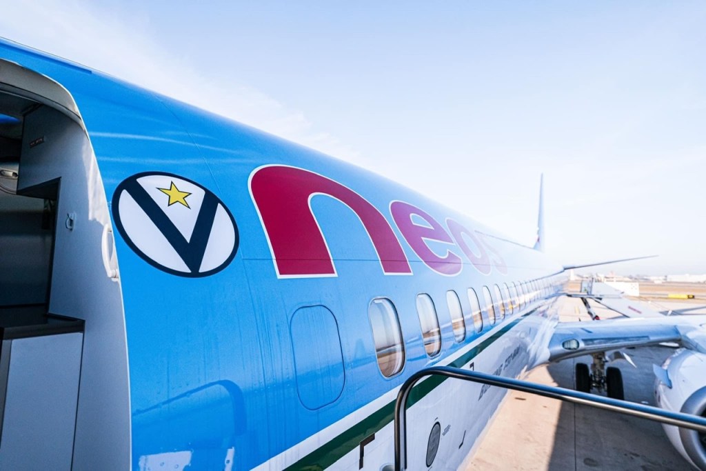 Il simbolo delle V nere, la squadra di basket della Virtus Segafredo Bologna e’ stato apposto a fianco della porta dell’aereo utilizzato da Neos per la trasferta di questa sera a Barcellona.