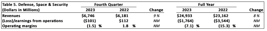 Il fatturato del quarto trimestre della divisione Defense, Space & Security è stato di 6,7 miliardi di dollari. Il margine operativo del quarto trimestre è stato dell’1,5%, principalmente a causa di 139 milioni di dollari di perdite su alcuni programmi di sviluppo a prezzo fisso. I risultati sono stati influenzati anche da prestazioni e mix sfavorevoli su altri programmi.