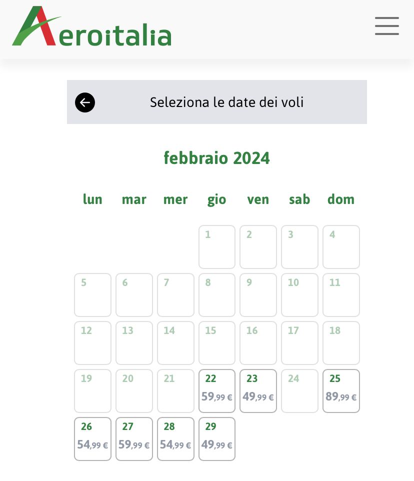 Allo stesso tempo la compagnia aerea italiana permette di acquistare il collegamento solo per le partenze a decorrere dal prossimo 22 febbraio 2024.