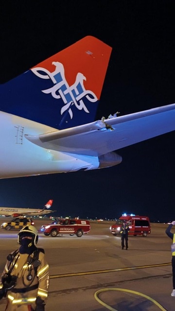 Nelle due immagini si vedono i consistenti danni riportati da un Embraer E195 OY-GDC della Marathon Airlines che ora vola Air Serbia.