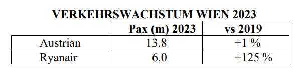 Nell’estate del 2024, i volumi di traffico di Ryanair in Austria aumenteranno del 15% raggiungendo 7 milioni di passeggeri, mentre l’AUA sovvenzionata dallo Stato a Vienna non ha visto una crescita significativa rispetto ai numeri pre-Covid. Nel 2023, Ryanair ha più che raddoppiato il volume di traffico pre-Covid (da 2,7 milioni a 6 milioni nel 2023), ottenendo di gran lunga la ripresa più rapida in Austria. Ryanair offre più scelta, più concorrenza e prezzi dei voli più bassi. In confronto, la controllata AUA di Lufthansa, sovvenzionata dallo stato, applica ancora tariffe più alte del 500% rispetto a Ryanair, non registrando alcuna crescita ma solo un aumento minimo dell’1% dal 2019 al 2023.