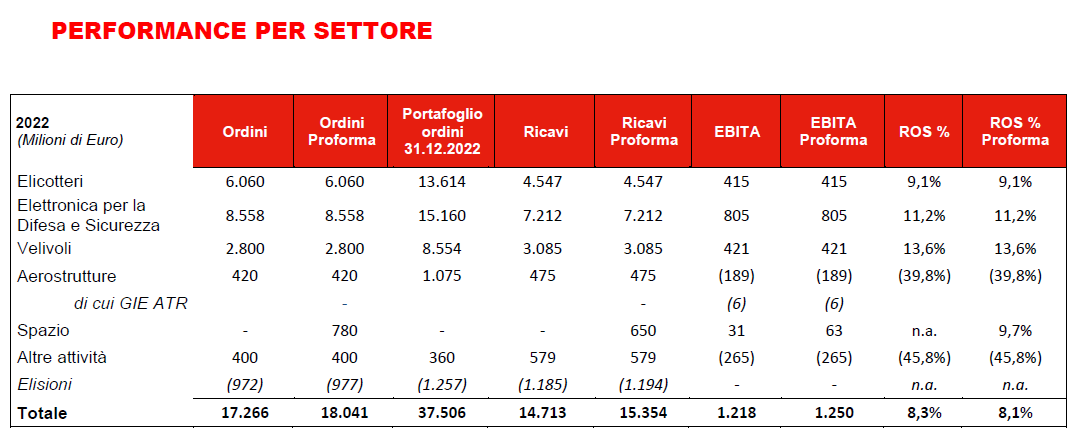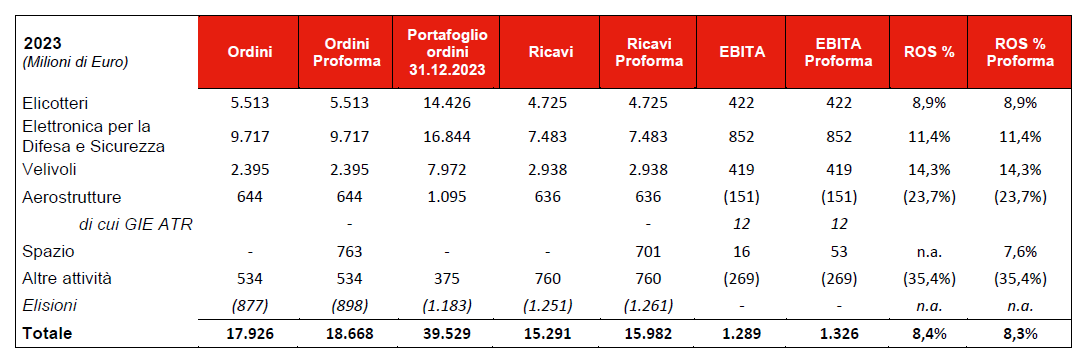 Gli Ordini evidenziano una crescita continua e strutturale, attestandosi vicino alla soglia di € 18 miliardi (€ 18,7 miliardi nel dato proforma), con una performance particolarmente positiva nella componente Europea dell’Elettronica per la Difesa e Sicurezza. La significativa crescita e il positivo andamento commerciale è ancor più rilevante considerando che gli Ordini del 2022 riflettevano l’ordine jumbo ricevuto dal Ministero della Polonia relativo agli elicotteri AW149.