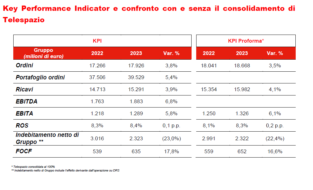 - Ordini € 17,9 miliardi (+3,8% vs 2022), al di sopra della Guidance, con un book-to-bill pari a 1,2