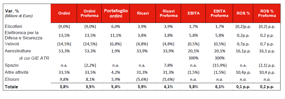 I Ricavi sono in crescita del 3,9% (+4,1% rispetto al dato Proforma consolidando Telespazio), grazie anche alla significativa ripresa delle Aerostrutture (+34%) e all’andamento dell’Elettronica per la Difesa e Sicurezza e degli Elicotteri. Alla crescita dei Ricavi si affianca una crescita dell’EBITA del 5,8% (+6% rispetto al dato Proforma consolidando Telespazio).