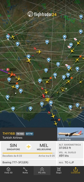 Il Boeing 777-3F2ER e’ ora ad una ventina di minuti dalla destinazione. Il collegamento Istanbul – Melbourne effettua uno stop a Singapore in entrambi i sensi.