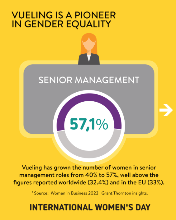 Con un fermo impegno nella promozione del talento femminile, della diversità e dell’inclusione, Vueling, società appartenente al gruppo IAG, consolida la presenza femminile nei ruoli dirigenziali, raggiungendo il 57% di presenza femminile nel comitato direttivo, composto da 4 donne e 3 uomini.