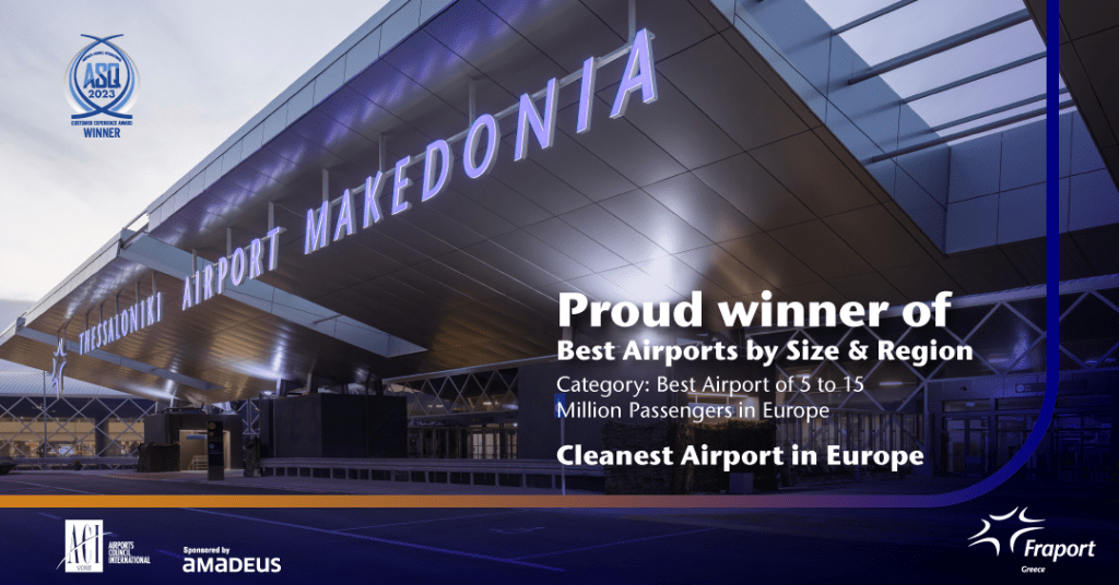 Fraport Grecia ha ricevuto il riconoscimento “2023 Airport Service Quality (ASQ) Awards” per l’aeroporto “Makedonia” di Salonicco. Per il secondo anno consecutivo, l’aeroporto è stato premiato come uno degli aeroporti leader in Europa nella categoria che ospita da 5 a 15 milioni di passeggeri all’anno. Inoltre, per la prima volta, è stato riconosciuto come uno dei migliori aeroporti d’Europa per la sua eccezionale pulizia.