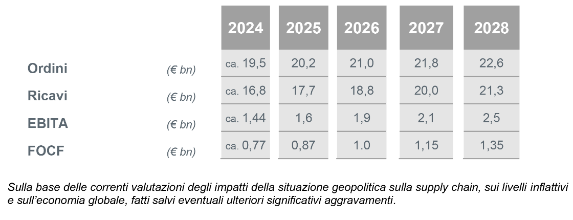 Piano Industriale 2024-2028: Ordini Complessivi a € 105 Miliardi, Ricavi a € 95 Miliardi, Redditività’ a doppia cifra nel 2026 e Raddoppio del FOCF a € 1,35 Miliardi alla fine del Piano rispetto al 2023: Questi sono i principali Target del Piano nei prossimi 5 anni.