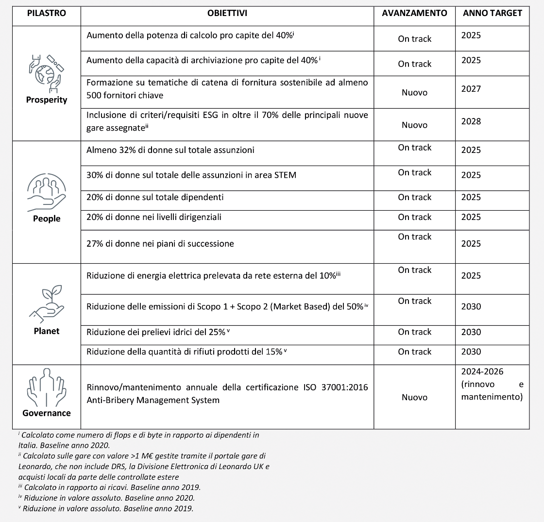La sostenibilità rappresenta uno dei fattori abilitanti del Piano Industriale di Leonardo ed è integrata lungo tutta la catena del valore. Coerentemente, tale approccio si riflette nel nuovo Piano di Sostenibilità 2024-2028 del Gruppo, che mira a raggiungere obiettivi di sostenibilità articolati sui pilastri Prosperity, People, Planet e Governance e che si focalizzano su: potenziamento del carattere sostenibile della catena di fornitura, con l’obiettivo di includere criteri ESG in almeno il 70% delle principali nuove gare di acquisto entro il 2028; promozione di una cultura che valorizzi diversità, equità e inclusione, con target orientati al rafforzamento del contributo femminile in azienda in termini di inserimenti e di presenza femminile nelle posizioni di leadership; riconferma del percorso di decarbonizzazione con la riduzione delle emissioni di CO2 Scopo 1 e 2 market-based in linea con gli impegni presi verso la Science-Based Targets initiative.