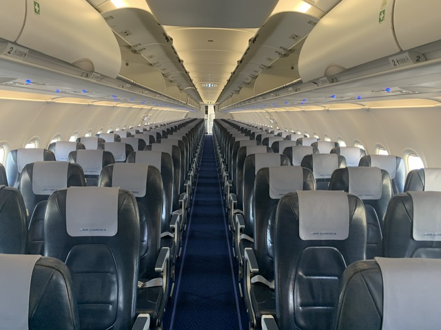 Noi siamo saliti a bordo di un A320neo in servizio da Bastia a Marsiglia. E’ una delle rotte in continuita’ territoriale e permette di evitare l’isolamento dalla Francia per ogni necessita’ da parte dei passeggeri. Il velivolo e’ con un interno da 186 posti in file da 6 posti, tre a destra e altrettanti a sinistra. Air Corsica ha scelto di installare nuove sedute ultra slim per assicurare un adeguato spazio alle gambe dei passeggeri in questo allestimento ad alta densita’. In virtu’ del fatto che i nuovi interni permettono di avere due toilettes nella parte posteriore nel blocco galley posteriore, la fila in piu’, la 32 e’ praticamente senza i finestrini. Infatti occupa lo spazio che in passato era occupato dalle due toilette.