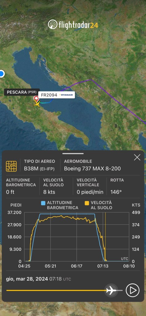 Il volo FR2094 era decollato alle 6:37 ed e’ atterrato a Pescara alle 8:18. L’inversione di rotta e’ avvenuta sulla Bosnia.