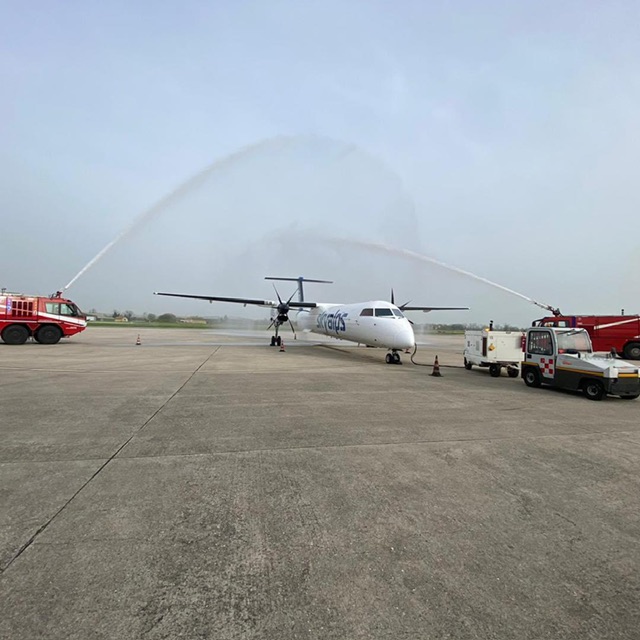 Il water cannon salute e’ stato il gesto di auspicio per questi voli che SkyAlps ha attivato dopo che il precedente vettore AeroItalia ha rinunciato alla convenzione a suo tempo stipulata.
