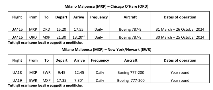 Il prolungamento del servizio stagionale tra Milano e Chicago si basa sui servizi giornalieri annuali di United da Milano a New York/Newark e tra Roma e New York/Newark, oltre ai voli giornalieri stagionali da Venezia e Napoli a New York/Newark e da Roma a Chicago, Washington Dulles e San Francisco. United offre fino a