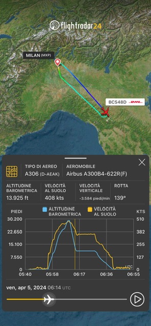 Alle 8:14 locali ha inserito 7700 sul transponder. In precedenza aveva raggiunto FL290 e dopo un paio di minuti ha iniziato una rapida discesa fino a FL110. Quindi e’ atterrato a Milano Malpensa alle 8:40. Il decollo e’ avvenuto alle 7:55.