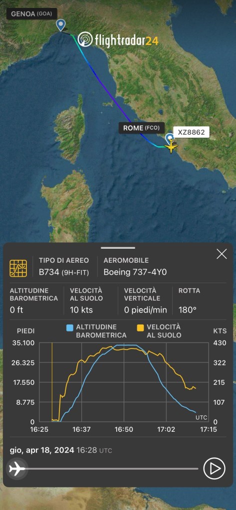 A Roma Fiumicino ha imbarcato la SS Lazio sul volo AEZ8862 e ha volato verso Genova dove la squadra di calcio aveva l’impegno di calcio di serie A contro il Genoa.