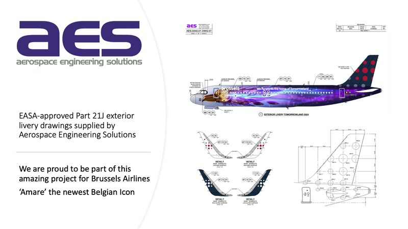 “Orgogliosi di far parte del Brussels Airlines ultimo progetto ‘Amare’, la nuova icona belga! Il nostro team di Aerospace Engineering Solutions ha fornito i disegni della livrea esterna Part 21J approvati dall’EASA per questo Airbus A320neo. La livrea Tomorrowland presenta la realtà aumentata, una novità mondiale, poiché l’uccello prende vita quando viene scansionato”.
