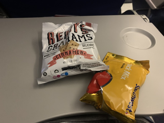 A bordo vengono distribuiti gratis un sacchettino di biscotti e salatini. Oltre a una bibita analcolica. Puo’ capitare il bicchiere oppure la lattina da 12 once, pari a 0,355 di litro. Birra e altro sono a pagamento.