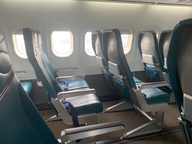 Come si vede dalle immagine tutto e’ sobrio, ma molto scarno. Tutto e’ in primis in relazione alla massima riduzione del peso mediante meno materiali oppure l’eliminazione di quelli ritenuti superflui. 128 sono i posti disponibili a bordo dei 20 Boeing 717/200 in servizio tra le isole Hawaii con Hawaiian Airlines. 160 sono le partenze quotidiane che garantiscono questi aerei estremamente apprezzati per la loro flessibilita’.