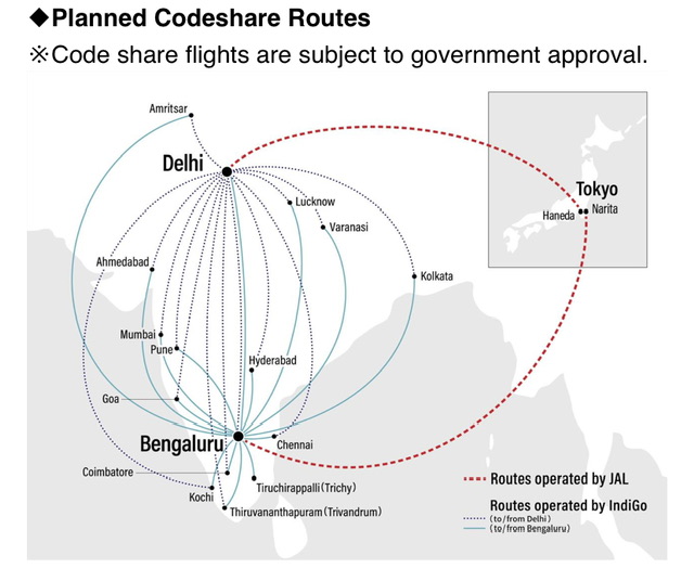 Attualmente, JAL opera servizi giornalieri tra Tokyo Haneda – Delhi e servizi tre volte a settimana tra Tokyo Narita – Bangalore, supportando la domanda di viaggi aerei tra i due paesi. Attraverso questa nuova partnership con IndiGo, che possiede la più grande rete nazionale in India, JAL sarà in grado di stabilire una vasta rete in tutta l’India, comprese le principali città come Mumbai, Chennai, Hyderabad, Calcutta, Ahmedabad, Amritsar, Kochi, Coimbatore, Thiruvananthapuram , Tiruchirappalli, Pune, Lucknow, Varanasi e Goa, che si collegano ai voli operati da JAL. Con IndiGo, noto per il suo servizio a bordo di alta qualità e la puntualità, JAL estenderà un servizio eccezionale a un numero ancora maggiore di viaggiatori attraverso questa partnership. Nel periodo successivo, i vettori cercheranno di espandere ulteriormente la cooperazione con il code sharing IndiGo sui voli operati da JAL.