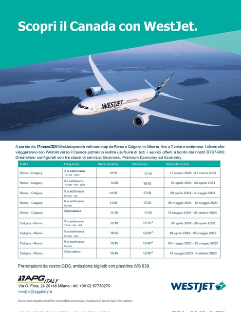 La compagnia aerea canadese WestJet dal 12 maggio scorso opera la rotta Calgary-Roma Fiumicino ogni giorno.