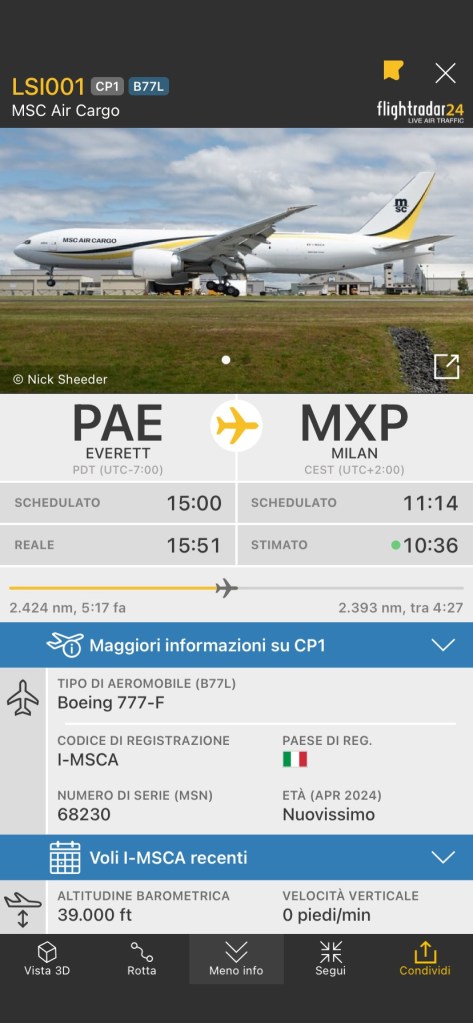 L’aeromobile con le marche I-MSCA e’ decollato da Everett uno degli aeroporti dove hanno sede gli stabilimenti Boeing. L’aereo ha msn 68230.