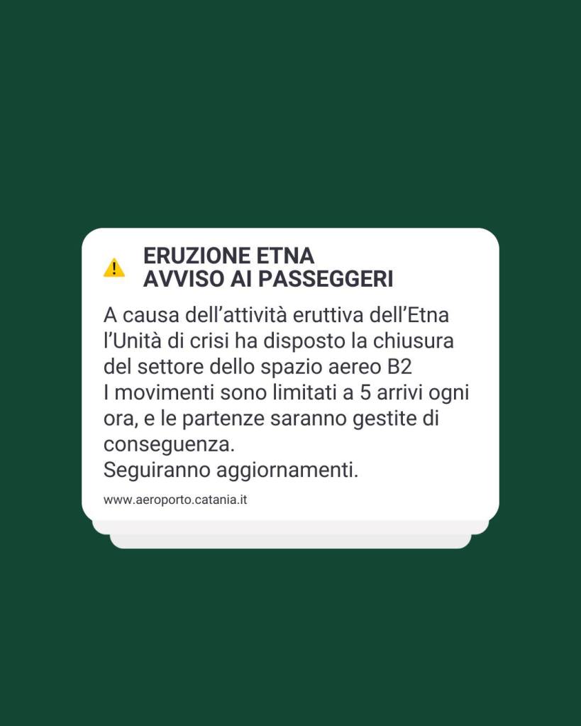 Questo è il messaggio che arriva dal gestore dell’aeroporto di catania in relazione alla riduzione dei movimenti attuata per il problema delle emissioni da parte dell’Etna, che è andto in eruzione.