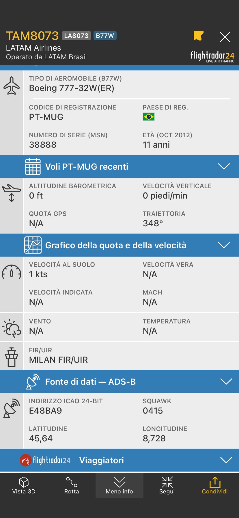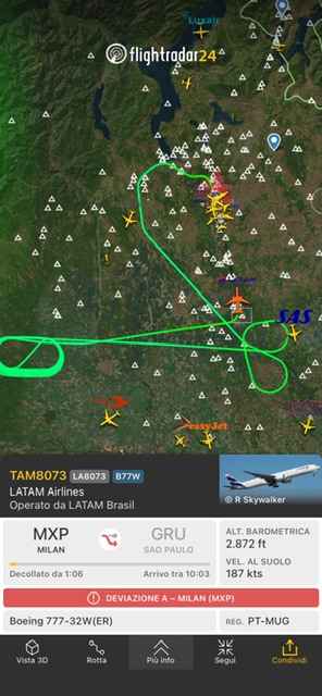 Nell’immagine si vede cosa ha fatto il Boeing 777-300ER LATAM che dopo il decollo alle 13:27 locali da Milano Malpensa non ha poi proseguito verso San Paolo.