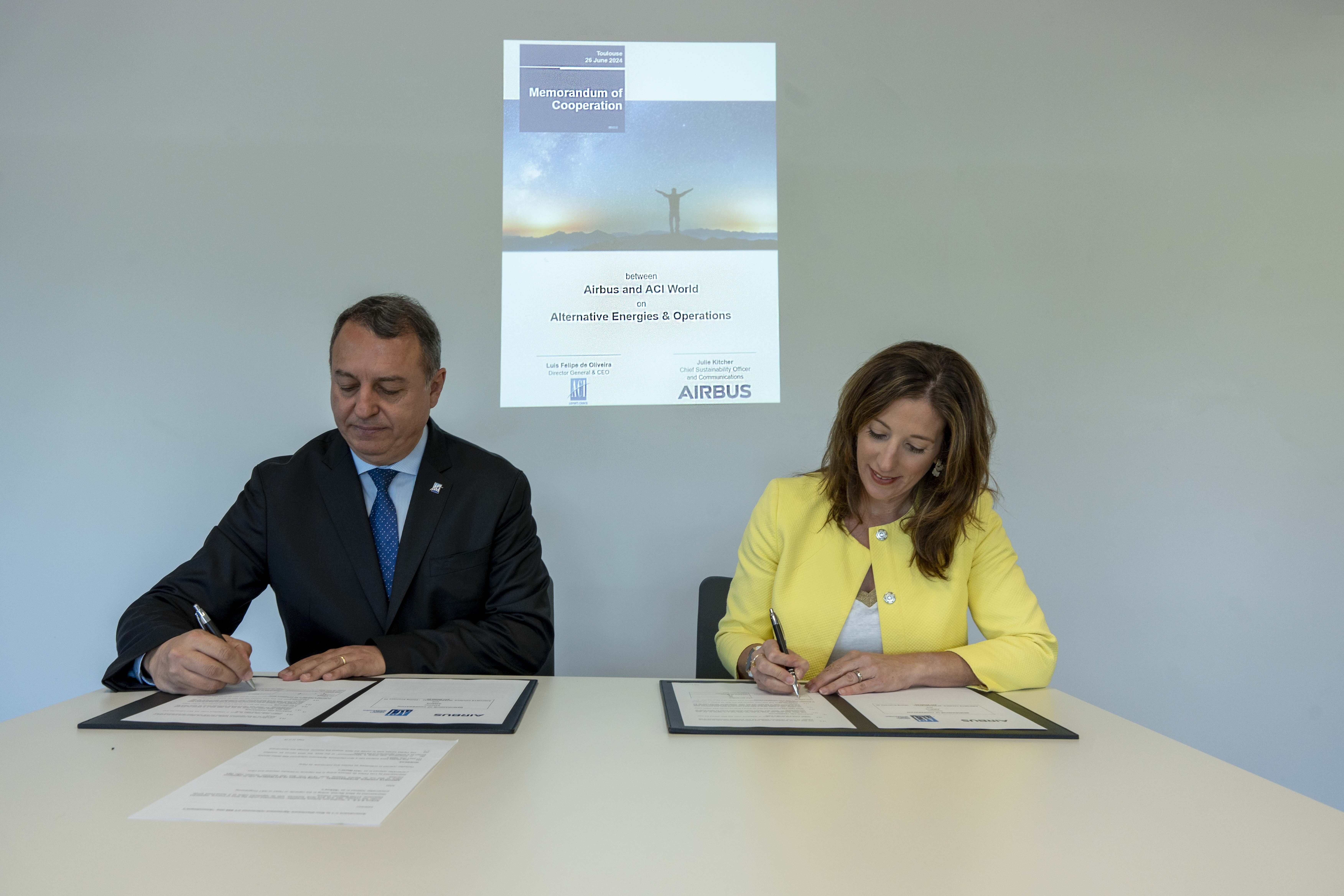 | Caption: Luis Felipe de Oliveira, ACI World Director General & CEO, and Julie Kitcher, Airbus Chief Sustainability Officer, signing the cooperation agreement |