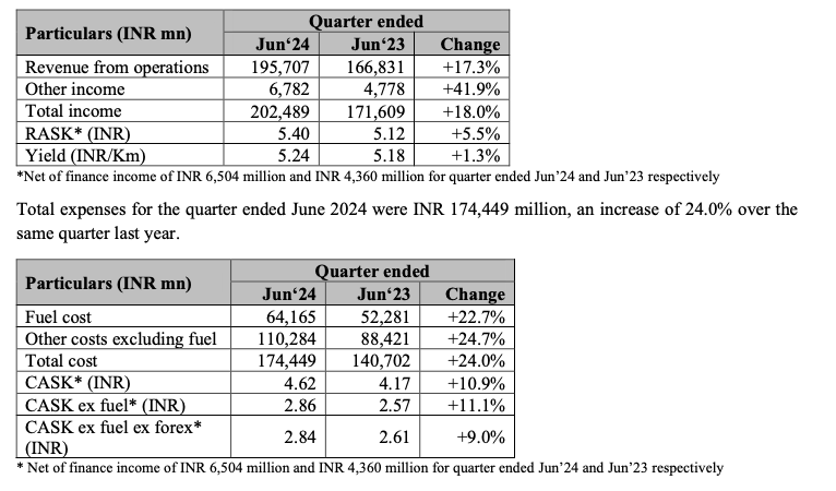 L’utile totale per il trimestre terminato a giugno 2024 è stato di 202.489 milioni di INR, con un aumento del 18,0% rispetto allo stesso periodo dell’anno scorso. Per il trimestre, i nostri ricavi derivanti dai biglietti passeggeri sono stati di 165.019 milioni di INR, con un aumento del 10,0% e i ricavi accessori sono stati di 17.634 milioni di INR, con un aumento del 13,9% rispetto allo stesso periodo dell’anno scorso.
