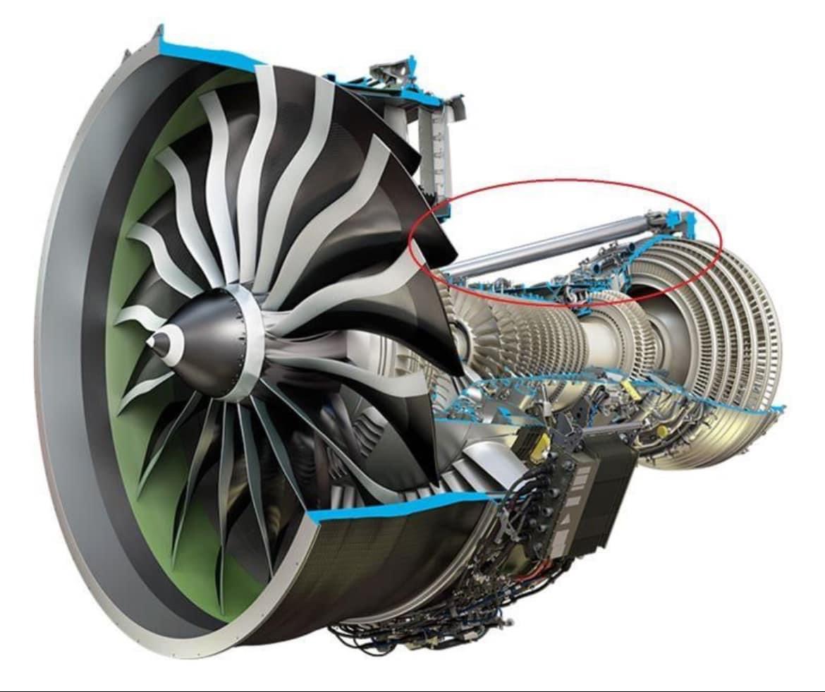 Il componente si chiama thrust link, due sono i particolari installati in ciascun propulsore e dal supporto motore posteriore partono e collegano per ciascuna asta un punto nella struttura del motore. Esse sono situate all’incirca a ore 10 e 2 della struttura dell’assieme frontale. La sua funzione e’ contemporanea di assorbire gli effetti di spinta scaricandoli verso il supporto motore e di qui’ alla struttura che sorregge il propulsore ed e’ parte anche della semiala.