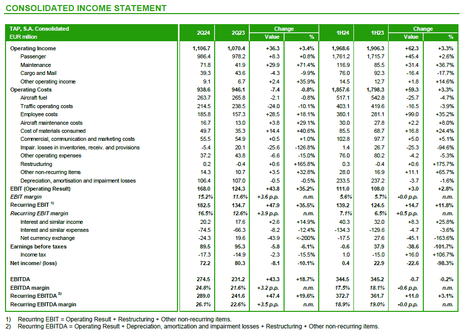 | Il vettore ha trasportato 7,7 milioni di passeggeri nei primi sei mesi dell’anno Resta costante il ritmo di riduzione del debito · L’utile netto positivo nel secondo trimestre del 2024 consente alla compagnia aerea di chiudere i primi sei mesi dell’anno con un utile di EUR 0,4 milioni. · I ricavi operativi della compagnia aerea hanno raggiunto EUR 1.969 milioni, con un aumento del 3,3% rispetto al primo semestre 2023, con una crescita significativa dei ricavi nel segmento Manutenzione e Ingegneria (+36,7%). · TAP ha inoltre ottenuto un notevole miglioramento del rapporto Debito Finanziario/EBITDA, raggiungendo un livello di 2,1x, rispetto al rapporto di 2,6x al 31 dicembre 2023 e di 5,2x al 31 dicembre 2019. · Nel primo semestre del 2024 la compagnia aerea ha trasportato un totale di 7,7 milioni di passeggeri, con un incremento dell’1,6% rispetto allo stesso periodo dell’anno precedente. · Il load factor è aumentato di 0,8 p.p. rispetto all’anno precedente e ha raggiunto l’81,1% nel 1° semestre 2024. |