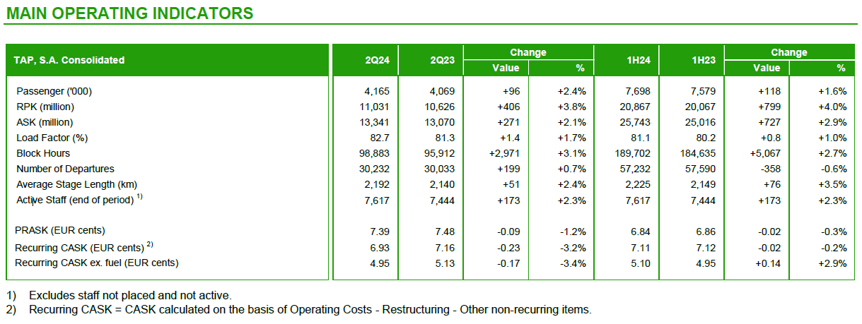 | Nel primo semestre del 2024 i ricavi operativi di TAP Air Portugal hanno raggiunto EUR 1.969 milioni, con un aumento del 3,3% rispetto al primo semestre del 2023, trainati, per quanto riguarda i ricavi passeggeri, dall’aumento della capacità (+2,9%), da un miglioramento del load factor (+0,8 p.p.), e da un significativo incremento dell’attività nel segmento Manutenzione e Ingegneria (+36,7%). TAP ha registrato, nella prima metà del 2024, un incremento dei risultati operativi ricorrenti rispetto al 2023, raggiungendo un EBITDA ricorrente di EUR 372,7 milioni (+ EUR 11,0 milioni), con un margine del 19%, e un EBIT ricorrente di EUR 139,2 milioni (+ EUR 14,7 milioni), con un margine del 7%. Nel primo semestre del 2024 TAP ha registrato un utile netto di EUR 0,4 milioni, grazie all’utile netto positivo generato nel secondo trimestre pari a EUR 72,2 milioni, che ha compensato l’utile netto negativo del primo trimestre del 2024. Al 30 giugno 2024 il Gruppo disponeva di una solida posizione di cassa pari a EUR 1.175,7 milioni, pari a un incremento di EUR 386,3 milioni rispetto alla fine del 2023. Si è inoltre registrato un significativo miglioramento del rapporto Indebitamento Finanziario/EBITDA, che ha raggiunto un livello di 2,1x, rispetto al rapporto di 2,6x al 31 dicembre 2023, rafforzando il percorso di deleveraging disciplinato e prudente della gestione finanziaria di TAP, con l’obiettivo di ispirare fiducia negli investitori. Per la seconda metà del 2024, le prenotazioni rimangono in linea con l’anno precedente, sebbene vi sia una qualche pressione sui rendimenti. Crescerà il focus sul mercato brasiliano con l’apertura di una nuova rotta: Florianópolis, e la riapertura di un’altra, Manaus, aumentando l’offerta a 13 destinazioni attraverso 15 rotte. Luís Rodrigues, CEO di TAP, ritiene che “nel secondo trimestre del 2024 abbiamo continuato il necessario percorso di trasformazione strutturale di TAP. L’investimento nelle persone e nelle operazioni continua a confermare il focus e a mostrare risultati: una significativa riduzione delle interruzioni, il continuo aumento della puntualità e della regolarità e l’incremento dell’NPS (l’indice di soddisfazione dei clienti), con conseguente crescita dei ricavi. Una particolare riconoscimento va all’area Manutenzione e Ingegneria, che sta iniziando a esprimere il proprio potenziale.” “La solida performance del secondo trimestre”, ha proseguito Luís Rodrigues, ”consente di ottenere un risultato netto positivo nel semestre che, nonostante la riduzione, viene raggiunto per la seconda volta consecutiva, ma ora senza tagli salariali.” “Continuiamo a percorrere la strada che ci siamo prefissati, con l’impegno del nostro personale e il sostegno dei nostri stakeholder: affermare TAP come una società sostenibile e redditizia e una delle più attraenti del settore”, ha concluso il CEO di TAP. ANALISI DEL SECONDO TRIMESTRE 2024 Nel secondo trimestre del 2024 (Q224) rispetto al secondo trimestre del 2023 (Q223) il numero di passeggeri trasportati è aumentato del 2,4% e il numero di voli operati dello 0,7%. Rispetto ai livelli pre-crisi del 2019 (Q219), il numero di passeggeri ha raggiunto il 92% e il numero di voli operati l’87%. La capacità (misurata in ASK) è aumentata del 2,1% rispetto al Q223, superando i livelli pre-crisi e registrando il 102% dei valori del Q219. Il Load Factor ha raggiunto l’82,7%, migliorando di 1,4 p.p. rispetto all’anno precedente, e diminuendo di 0,8 p.p. rispetto ai livelli pre-crisi. I ricavi operativi sono stati pari a EUR 1.106,7 milioni, registrando un incremento del 3,4% rispetto al Q223, superando e rappresentando il 133% dei ricavi operativi del Q219. I ricavi da biglietti sono aumentati di EUR 8,3 milioni di (+0,8%) rispetto al Q223, per un totale di EUR 986,4 milioni, generando un PRASK di 7,39 centesimi di euro, con un calo dell’1,2% (-0,09 centesimi di euro) rispetto al Q223 e un aumento del 30,2% (+1,71 centesimi di euro) rispetto al Q219. I ricavi da Manutenzione sono aumentati di EUR 29,9 milioni (+71,4%) rispetto al Q223, per un totale di EUR 71,8 milioni, principalmente grazie all’aumento dell’attività nella manutenzione dei motori. I ricavi del segmento Cargo e Posta sono diminuiti di EUR 4,3 milioni, attestandosi a EUR 39,3 milioni, in calo del 9,9% rispetto al secondo trimestre del 2023, a causa della continua normalizzazione dei rendimenti del settore cargo che si sono verificati sul mercato. I costi operativi ricorrenti sono stati di EUR 924,1 milioni, registrando una flessione dell’1,2% – pari a EUR 11,6 milioni – rispetto al secondo trimestre del 2023. Questa variazione è dovuta principalmente alla diminuzione dei costi operativi del traffico (- EUR 24,0 milioni, pari al 10,1%) per effetto della riduzione delle assunzioni nel settore ACMI e della riduzione dei costi con irregolarità, e alla diminuzione dei costi di svalutazione (- EUR 25,6 milioni), incluso lo storno della perdita di valore relativa a Groundforce derivante dall’approvazione del suo piano di ristrutturazione, compensata dall’aumento dei costi del personale (+ EUR 28,5 milioni, pari al 18,1%) per effetto dei nuovi accordi aziendali entrati in vigore nella seconda metà del 2023. Il CASK complessivo dei costi operativi ricorrenti è diminuito del 3,2% (-0,23 centesimi di euro), raggiungendo 6,93 centesimi di euro, rispetto al secondo trimestre 2023. Escludendo i costi del carburante, il CASK dei costi operativi ricorrenti è stato di 4,95 centesimi di euro, in calo del 3,4% (-0,17 centesimi di euro) rispetto al secondo trimestre 2023. L’EBITDA ricorrente si è attestato a EUR 289,0 milioni nel Q224, con un aumento di EUR 47,4 milioni (+19,6%) rispetto al Q223. L’EBIT ricorrente è aumentato di EUR 47,9 milioni (+35,5%) rispetto al Q223, per un totale di EUR 182,5 milioni, con un margine del 16,5%. Considerando le voci non ricorrenti, l’EBIT ha raggiunto 