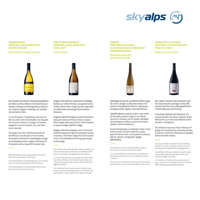 Oltre alla mission di trasportare passeggeri da e per l’Alto Adige o da altri mercati , SkyAlps ha la missione di promuovere le eccellenze del suo territorio come i vini. Questa e’ la nuova catta dei vini disponibile in settembre sui voli della compagnia aerea altoatesina, la quale ha diversi mercati.