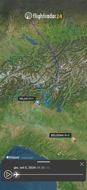 Un volo Ryanair da Charleroi, la FR3660 e’ atterrata a Bologna. Per raggiungere l’aeroporto felsineo ha poi raggiunto la Svizzera , poi di nuovo in Lombardia, quindi in Emilia Romagna.