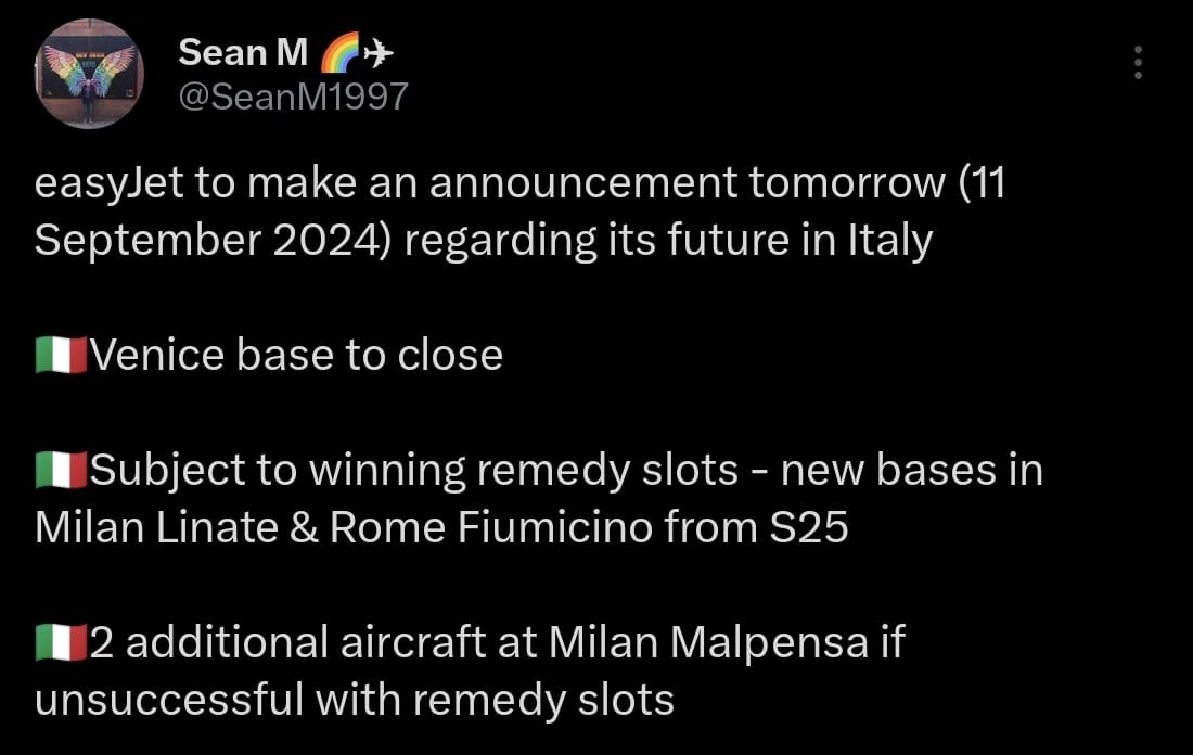 easyJet e’ pare pronta a modifiche sostanziali sul mercato italiano con un annuncio che dovrebbe essere rilasciato domani, ma che viene anticipato su X dal preciso @SeanM1997.