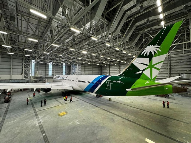 Questo e’ il Boeing 787-9 , che Saudia ha fatto predisporre da una ditta specializzata con la livrea ad hoc per il prossimo National Day che occorrera’ il 23 settembre 2024.