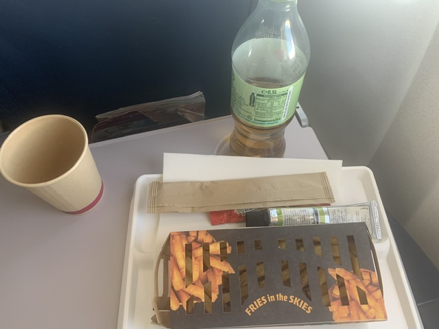 Oltre alle patate fritte, c’e’ anche un kit di salse come una maionese vegana del noto brand JeanBaton e il ketchup della Heinz. Non dimentichiamo che le proposte sono tedesche e che il nercato leisure o business e’ teutonico per la maggior parte. In partivolare su questo volo da Antalya a Colonia dove oltre il 90% dei passeggeri che dalle spiagge turche ritornano mesti alla Ruhr e’ germanico. Poi c’e’ in un ottica green recycle la forchetta in legno, inserita in un sacchetto di carta riciclata. La bevanda e’ un soft drink alla mela frizzante. Il prezzo e’ di 9€.
