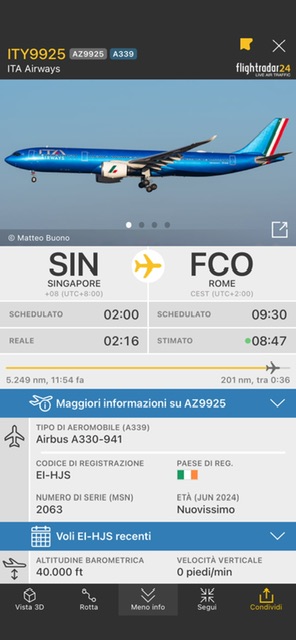 L’aereo e’ atterrato alle 00:28 locali di oggi come AZ9003 e poi giusto il tempo di scaricare tutto, cambiare l’equipaggio, fare pulizie, catering e rifornire i serbatoi di carburante e poi alle 2:16 e’ nuovamente decollato verso Roma Fiumicino. Il suo arrivo, il volo AZ9925 sara’ tra poco, infatti ha appena traguardato la costa della Basilicata. Quasi 13 ore sara’ la lunghezza del volo da Singapore a Roma Fiumicino.