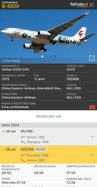 E’ un aereo celebrativo , il Worldskill Shark ad aver effettuato il volo MU786 che questa notte ha impiegato 12 ore e 28 minuti , grazie alla possibilita’ di sorvolare lo spazio aereo russo, che accorcia di tanto il viaggio.