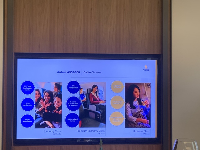 Poi ha spiegato quali prodotti la compagnia offre alla clientela, “la nostra business class ha quattro posti per fila, uno per ogni finestrino e due al centro, ma tutti i passeggeri hanno l’accesso al corridoio. I nostri sedili sono larghi quasi 72 cm., si reclinano fino a essere orizzontali come nel letto di casa propria per una lunghezza di oltre 1,98m. Il monitor é da 18 pollici con il superlativo sistema di intrattenimento KrisWorld. Questo IFE ha migliaia di contenuti a disposizione, tanti da dover volare Singapore Airlines molte volte per scoprirlo tutto.