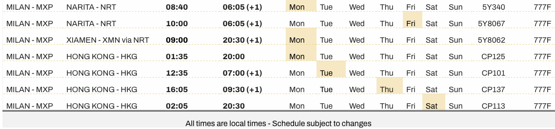tutte e quattro le rotazioni sono operate da AlisCargo Airlines con il suo Boeing 777-200LR F I-MSCA.