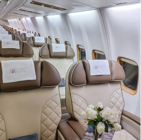 Tutti i dettagli vengono curati in ogni minima cosa. L’aereo proposto a questi potenziali segmenti di traffico é un Boeing 737-500, che fino al 2015 ha operato voli di linea e poi é passato a quelli esclusivi con un totale adeguamento dell’interno al nuovo utilizzo.