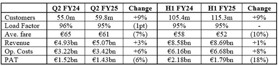 Ryanair Holdings plc oggi (4 novembre) ha riportato un utile dopo le imposte del primo semestre di 1,79 miliardi di €, che è inferiore del 18% rispetto al PAT del primo semestre dell’anno precedente di 2,18 miliardi di €, poiché la forte crescita del traffico (in aumento del 9%) a 115 milioni di clienti è stata compensata dalle tariffe aeree più basse, che sono diminuite del 7% nel secondo trimestre.