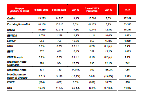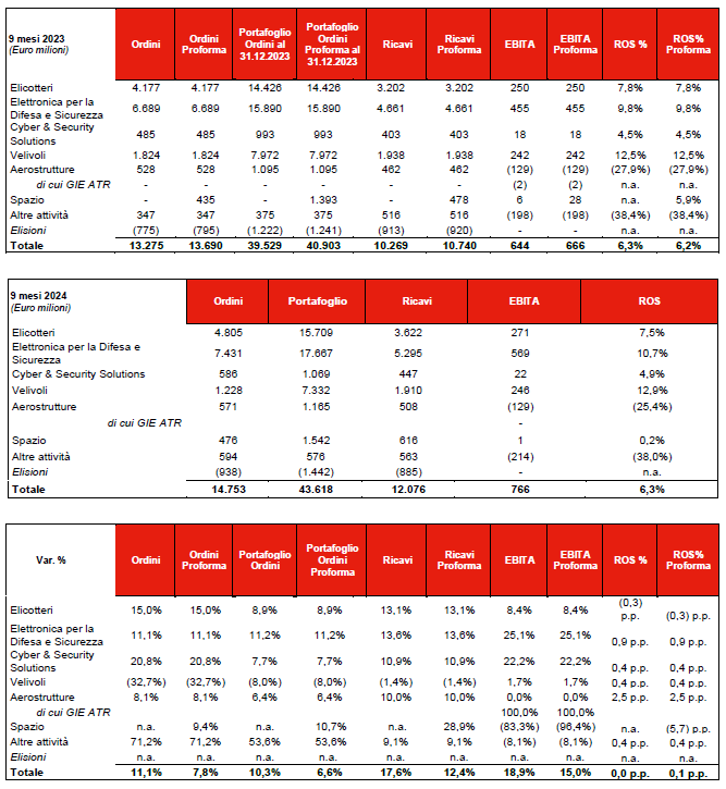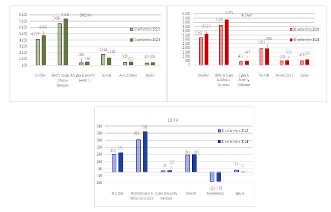 Nei primi nove mesi del 2024, gli Ordini e i Ricavi registrano un incremento, rispettivamente pari al 11,1% (+7,8% rispetto al dato di settembre 2023 Proforma) e al 17,6% (+12,4% rispetto al dato Proforma), trainati in particolare dai business dell’Elettronica per la Difesa e Sicurezza e degli Elicotteri.